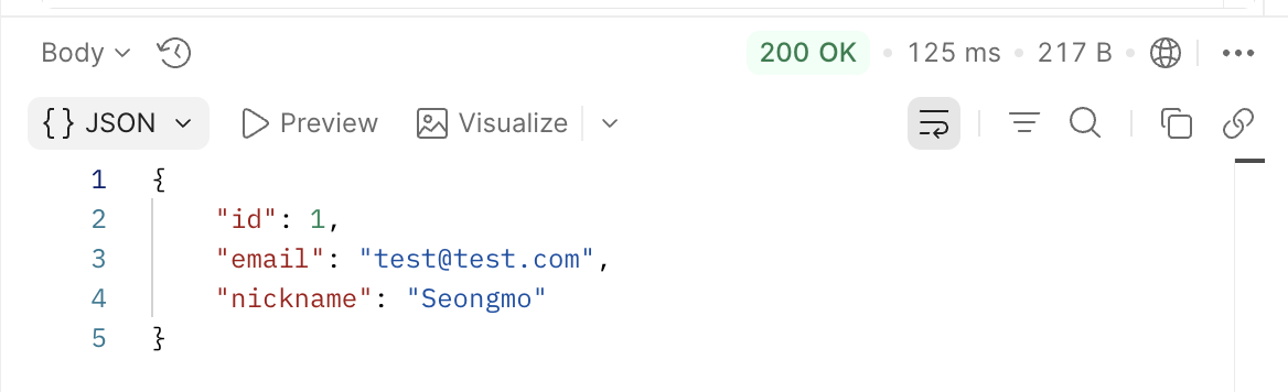 위와 같이 회원가입 요청을 보내면 아래와 같이 응답이 온다.
