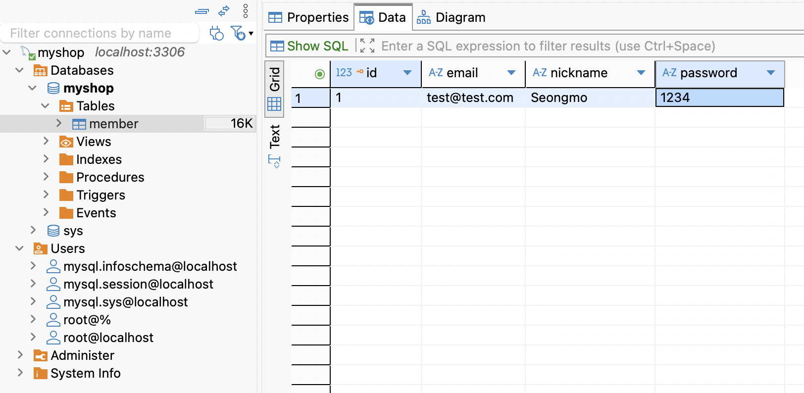 Postman으로 회원가입 요청을 보낸 뒤 DBeaver로 myshop DB의 member 테이블을 직접 확인할 수도 있다.
