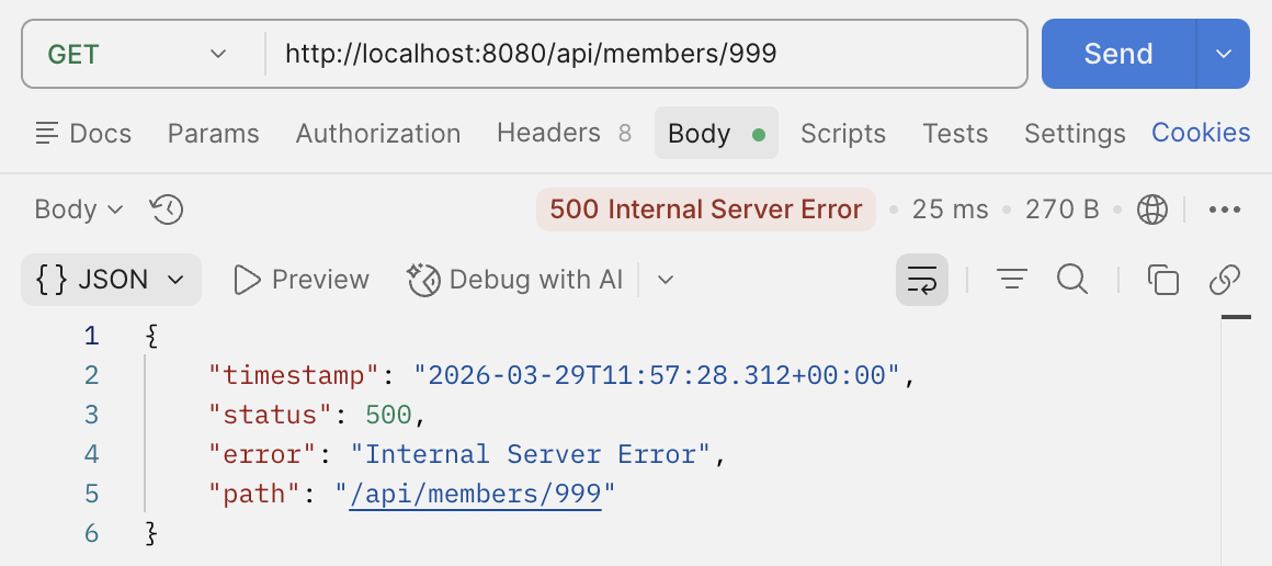 일단 지금 코드에서 존재하지 않는 회원을 조회하면 어떤 응답이 오는지 확인해보자.