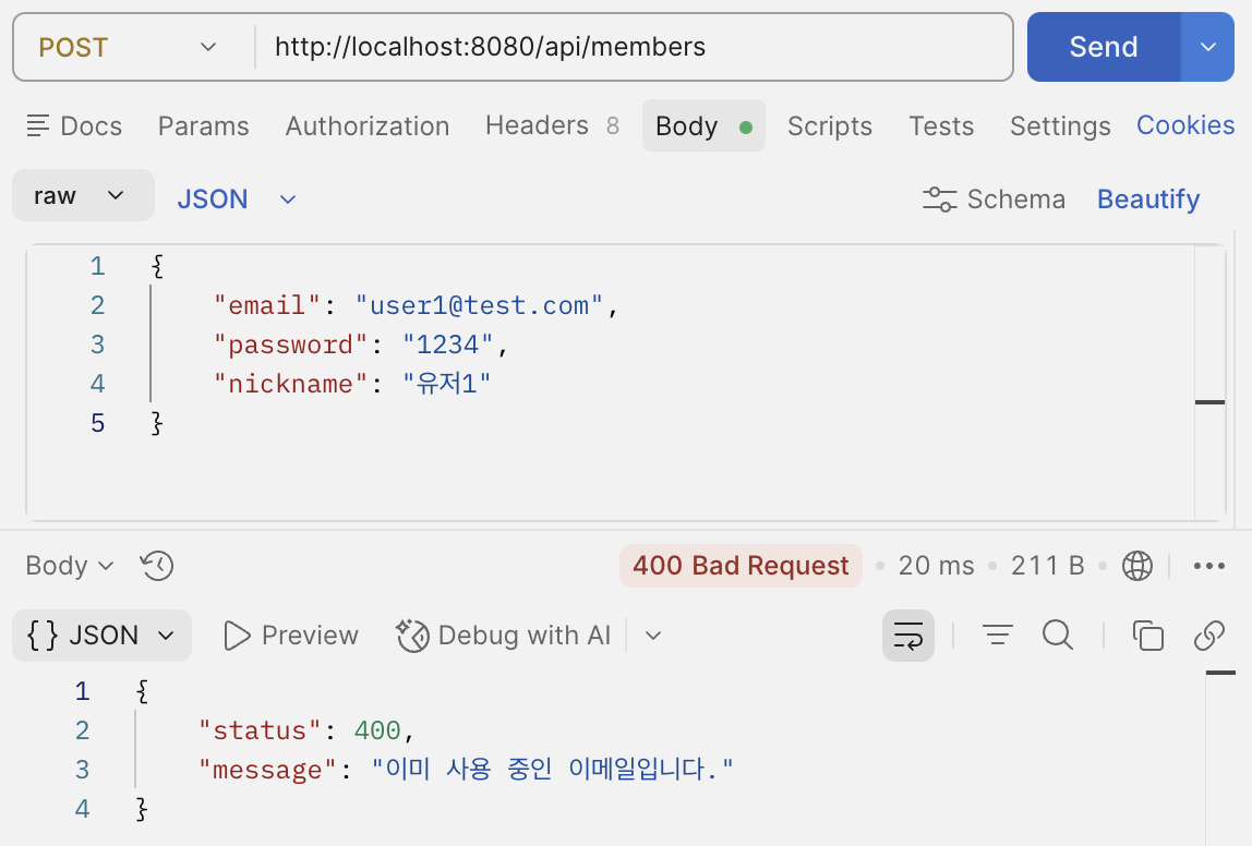 수정한 에러 코드와 메시지가 잘 반환되는 것을 알 수 있다.